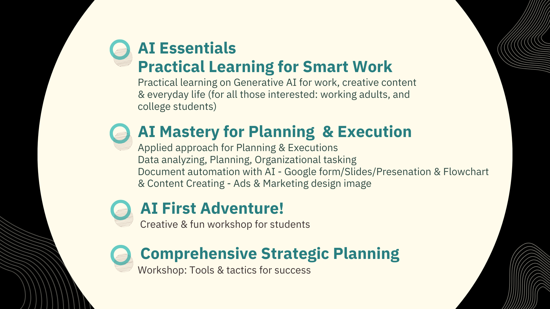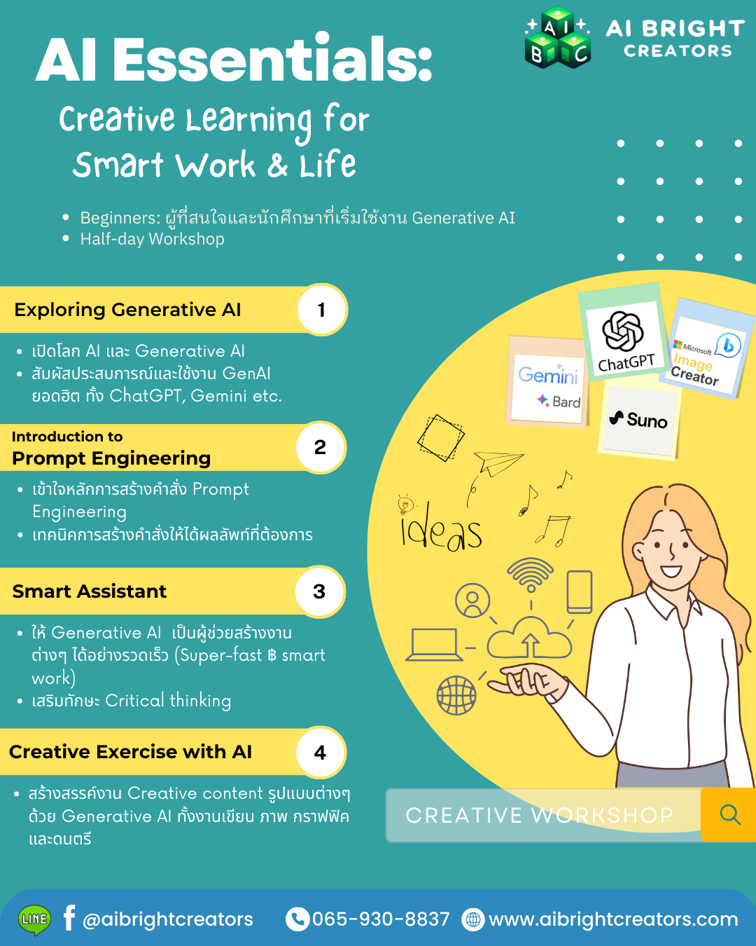คอร์สอบรมการใช้ Generative AI อย่างสร้างสรรค์ สำหรับทุกระดับ ตั้งแต่ผู้สนใจเริ่มต้น นักเรียนนักศึกษา ไปจนถึงผู้บริหารและผู้ใช้งานจริงในองค์กรต่างๆ !
